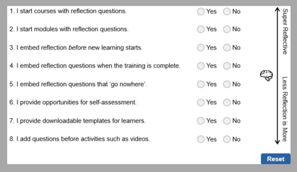 This activity served as a ‘temperature check’ for how much reflection opportunity course designers build into courses for their learners.
